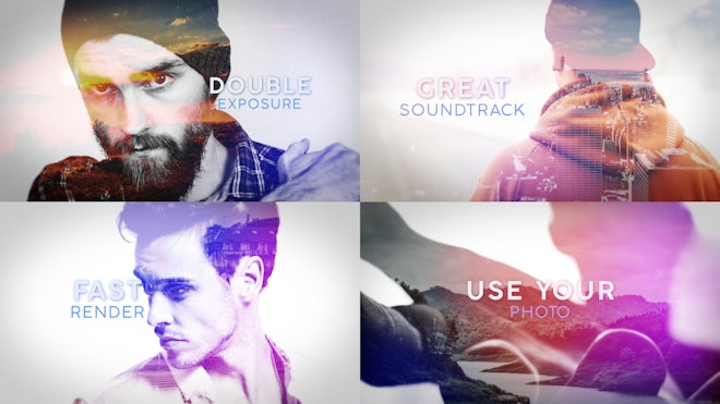 Double Exposure Slideshow is a professionally designed and elegantly animated After Effects template with soft light leaks, simple text animations and smooth transitioning effects. It's so easy to use, simply edit the text, drag and drop in your new media and hit render. A cool intro or opener to your slideshows, presentations, promotions and events videos. No plugins required. Available in HD.