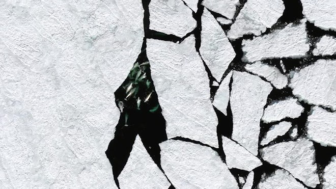 Beluga Whales Swimming In An Arctic Crack Of Broken Ice Shelf, Top Down Aerial